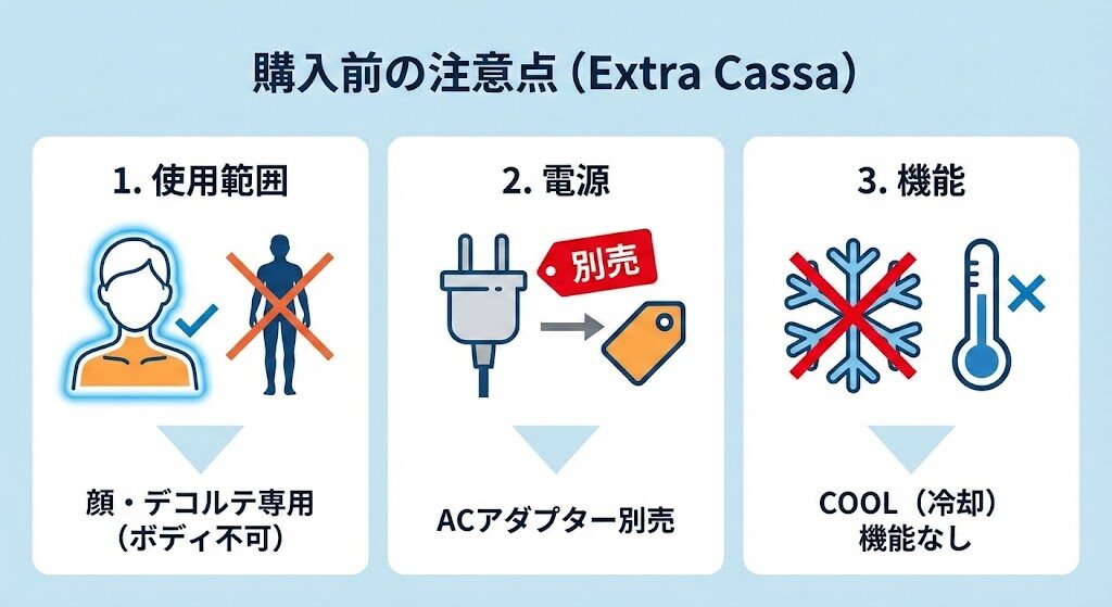 メリットばかりが目立つ美顔器ですが、購入後に「こんなはずじゃなかった…」と後悔しないために、エクストラカッサとMEラボンエクラのプロの目線で必ず確認してほしい3つの注意点を解説します。